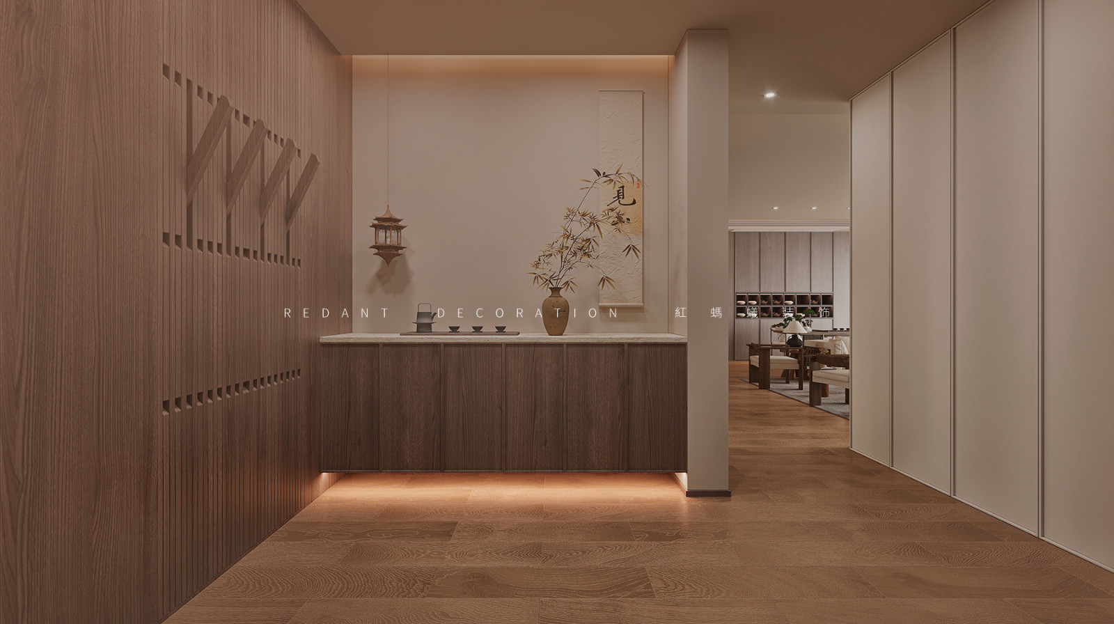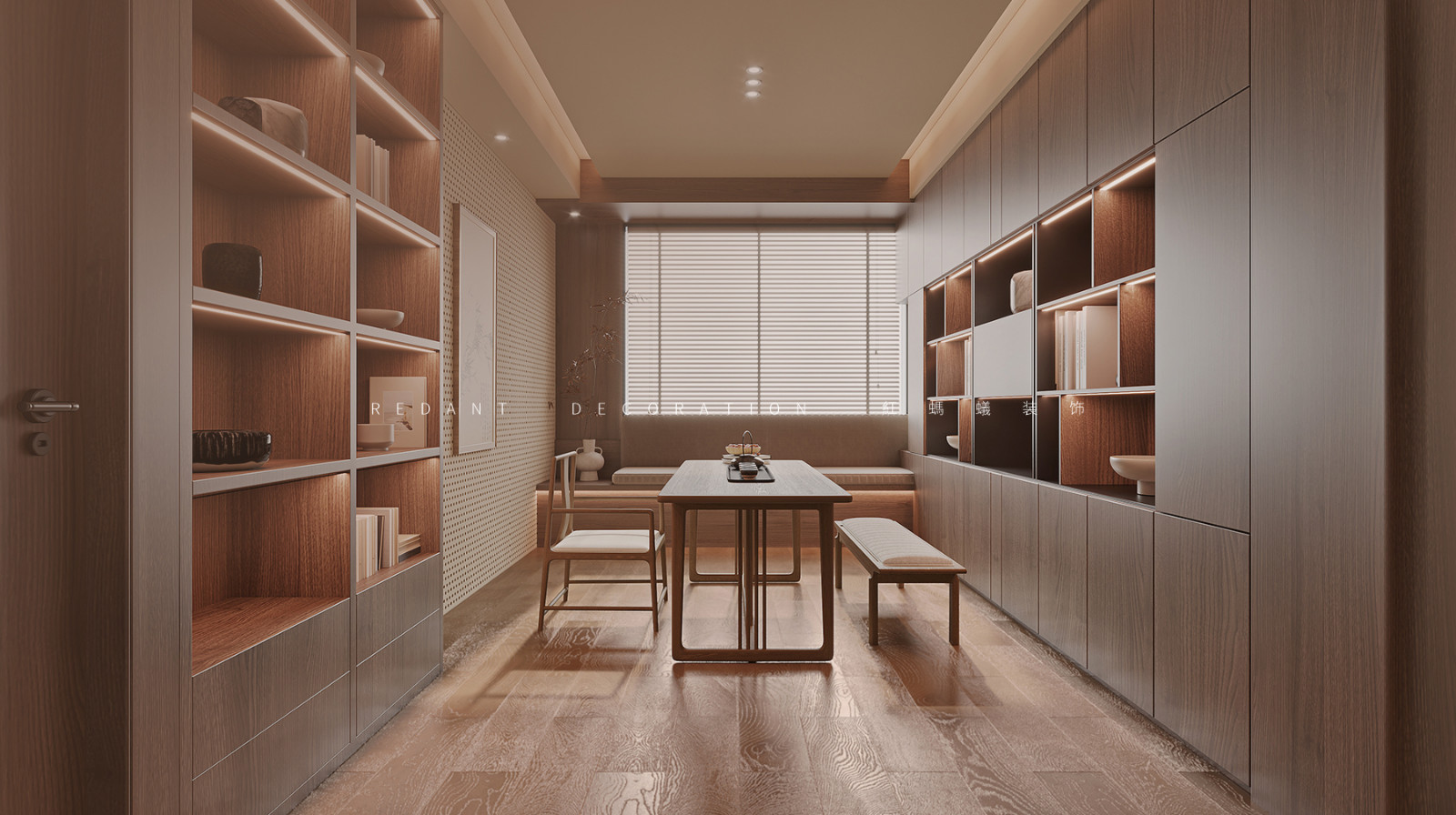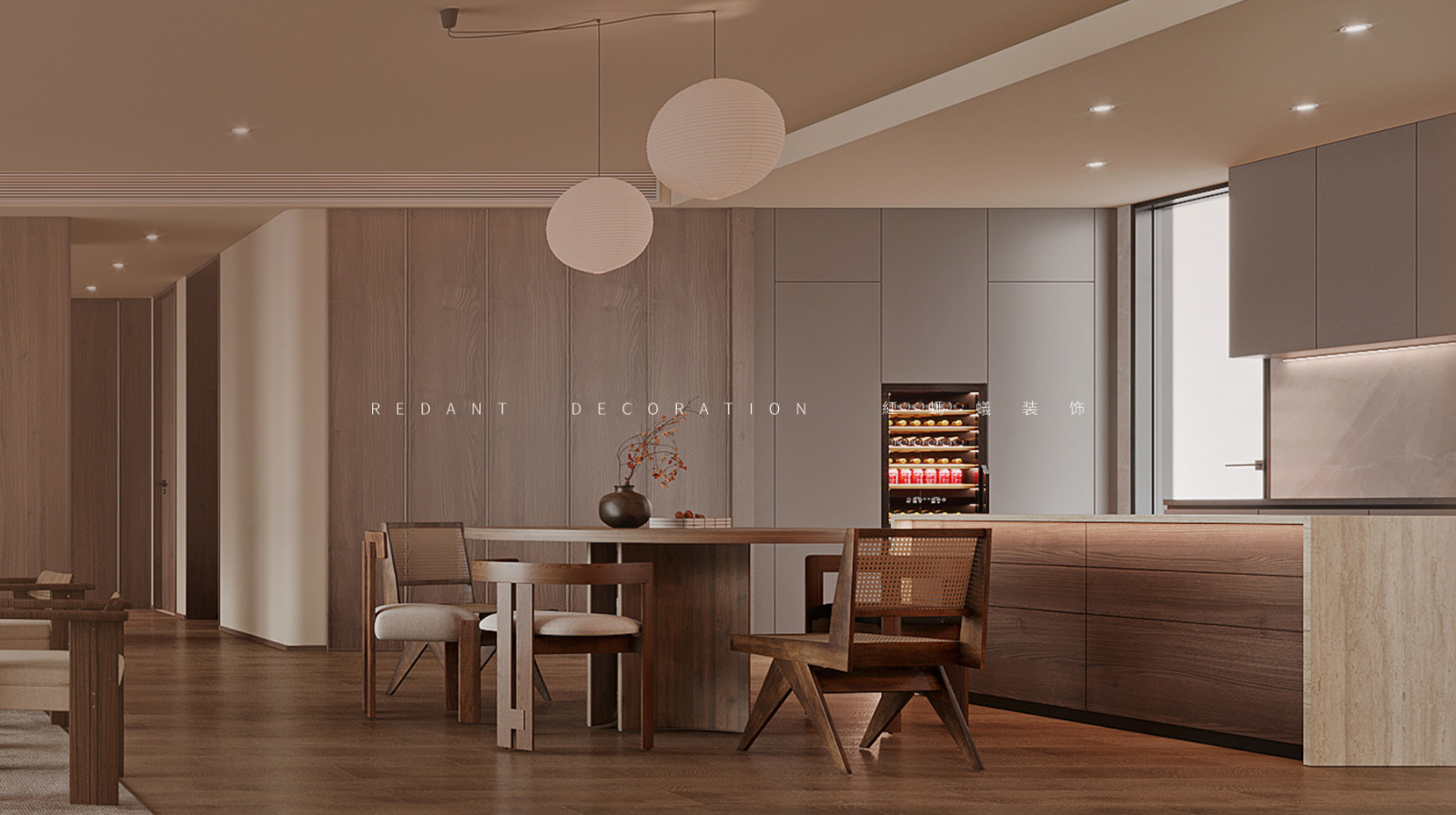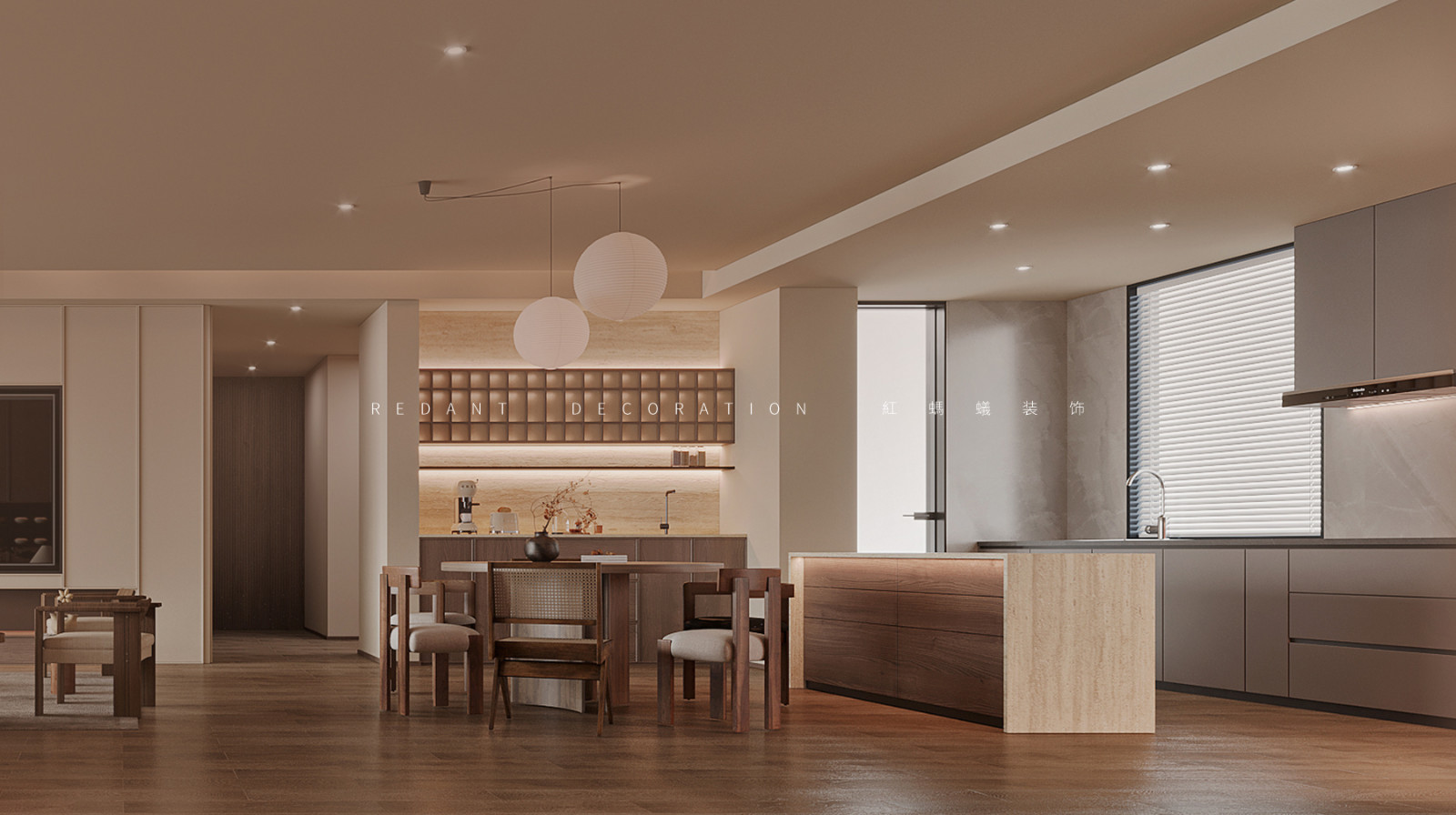 餐厅的设计采用天然材料,用最柔和的颜色,最真实的纹理,表达最淳朴的生活。造型别致的线型吊灯,打造了一个舒适优雅的就餐环境。