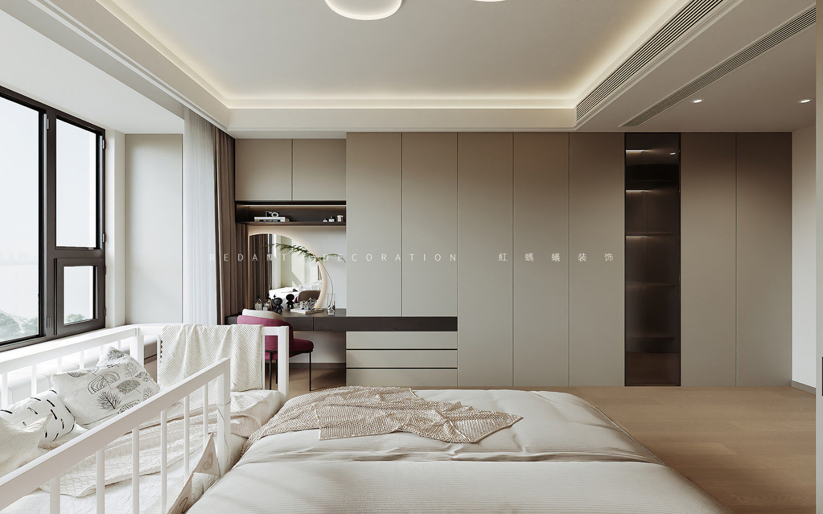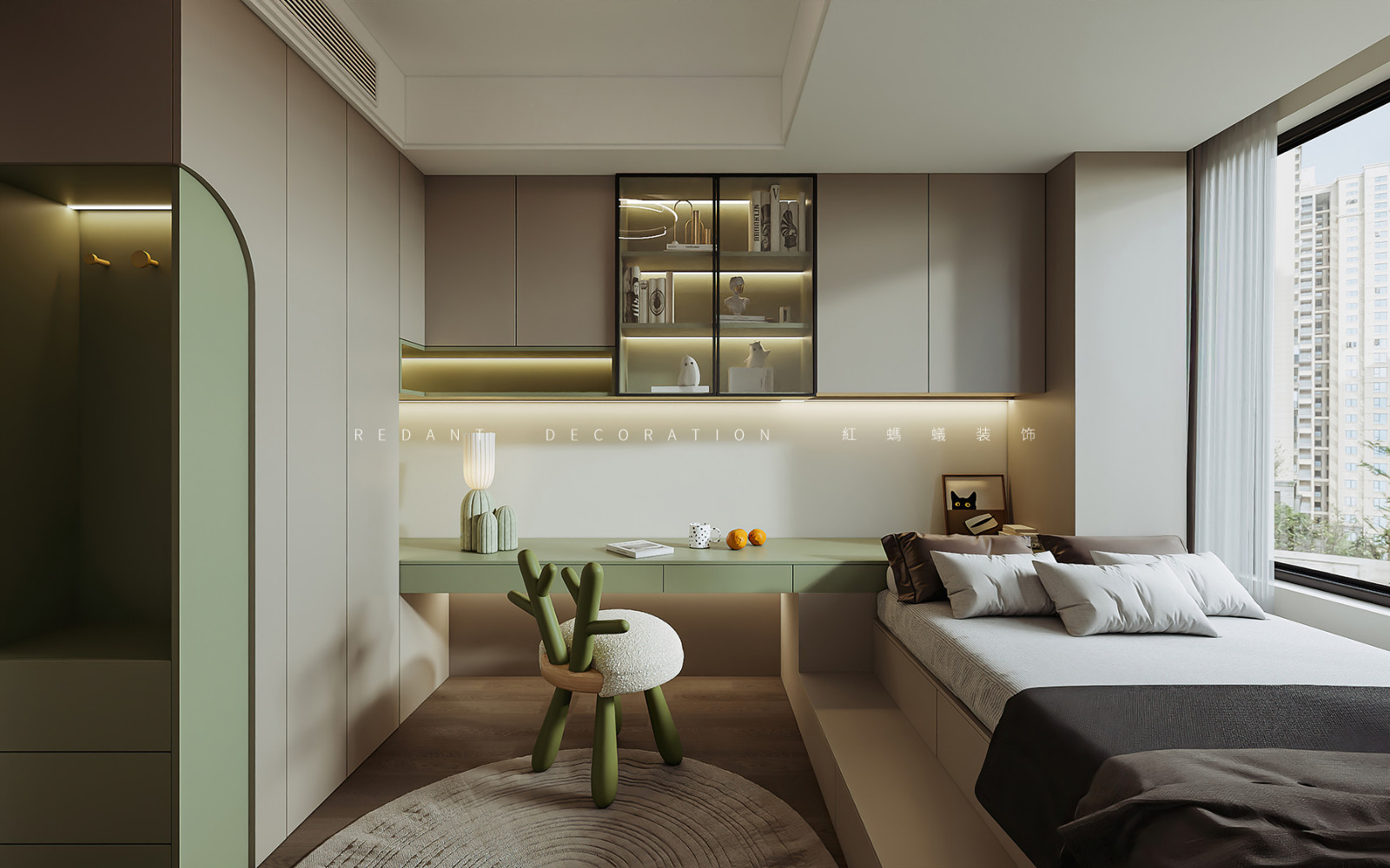 主卧延续低饱和色调,定制柜体藏起琐碎,开放格与灯带营造温馨氛围,临窗书桌让工作也有了诗意背景。儿童房以莫兰迪色系叠加趣味家具,云朵灯、造型座椅,把童真小心思融入轻奢语境,成长空间满是温柔治愈。