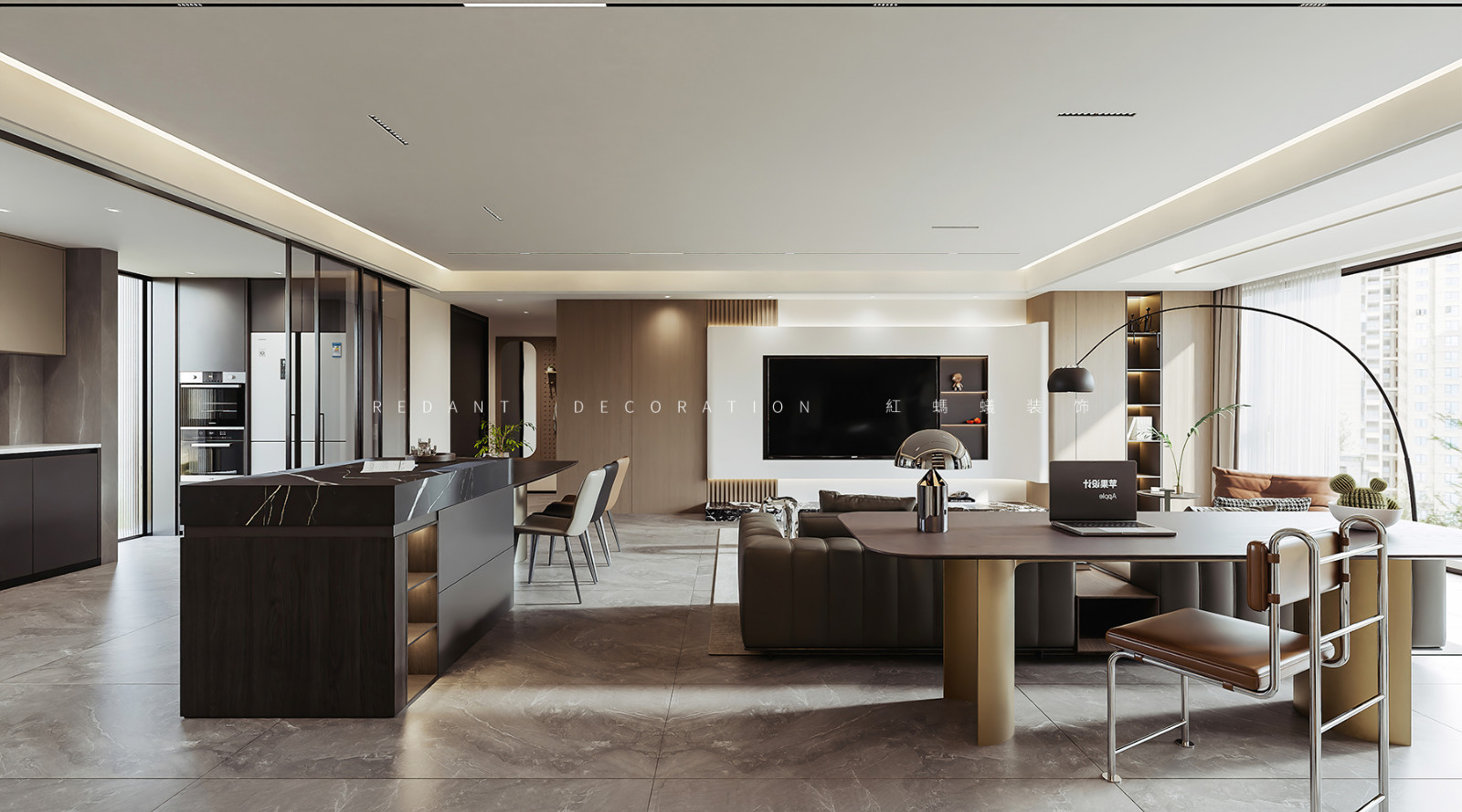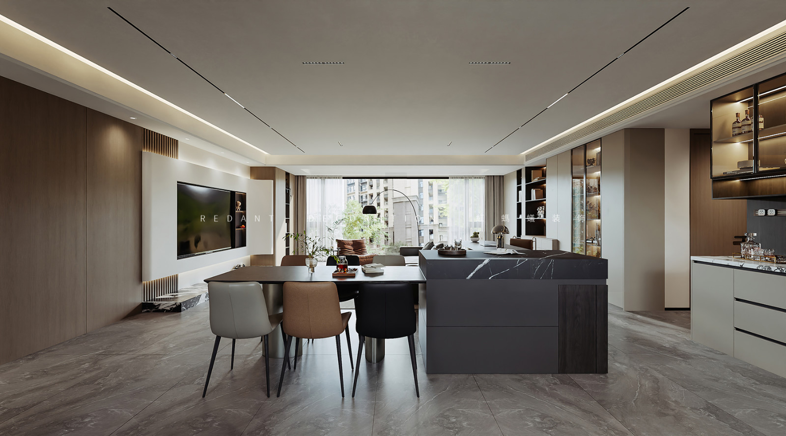 客餐厨一体化设计,消弭空间边界。浅灰与木色铺陈基底,石材岛台如精致容器,承载烹饪互动与社交场景。悬浮电视墙简洁利落,弧形落地灯勾勒优雅弧影,阳光透过大窗倾洒,让家人共处、朋友相聚都成为沉浸式的质感体验。
