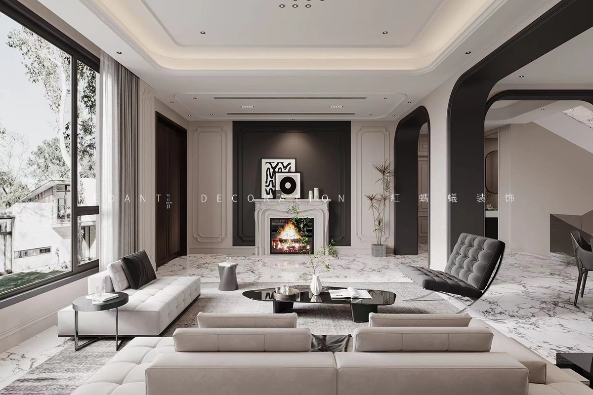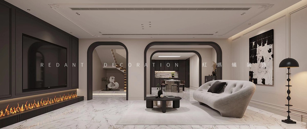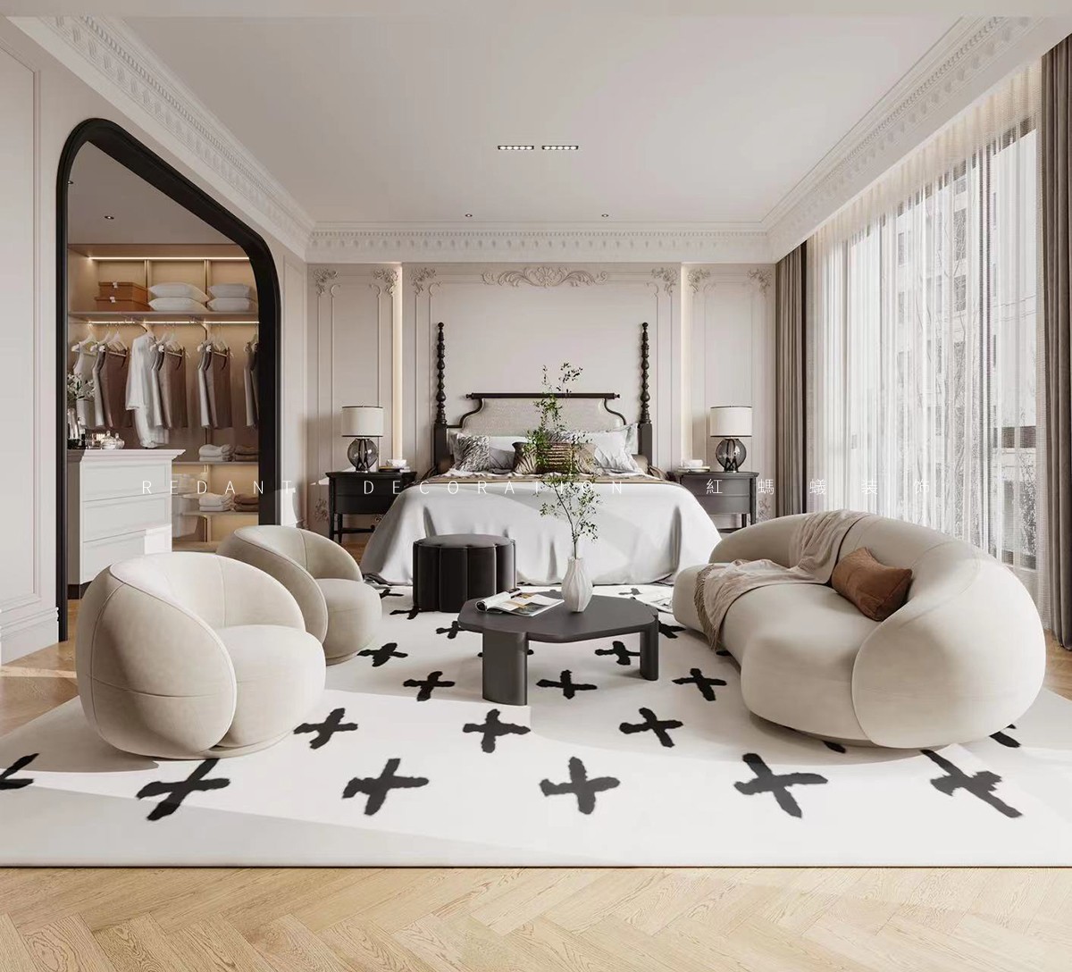 本方案选择了明亮的白色为主色调,并结合了灰色、米色的点缀色,和部分重色增加高级感。在视觉的平衡上,由大块面的简单硬装和家具逐渐过渡到家具上小面积的繁复造型,再到留白的地毯,使空间呈现一种呼吸感。橙色绿色作为跳色,点亮了空间。多次使用圆弧门洞和圆弧的家具造型,柔和空间,增加法式的优雅感。长虹玻璃产生一种半遮半掩朦胧的美感。
