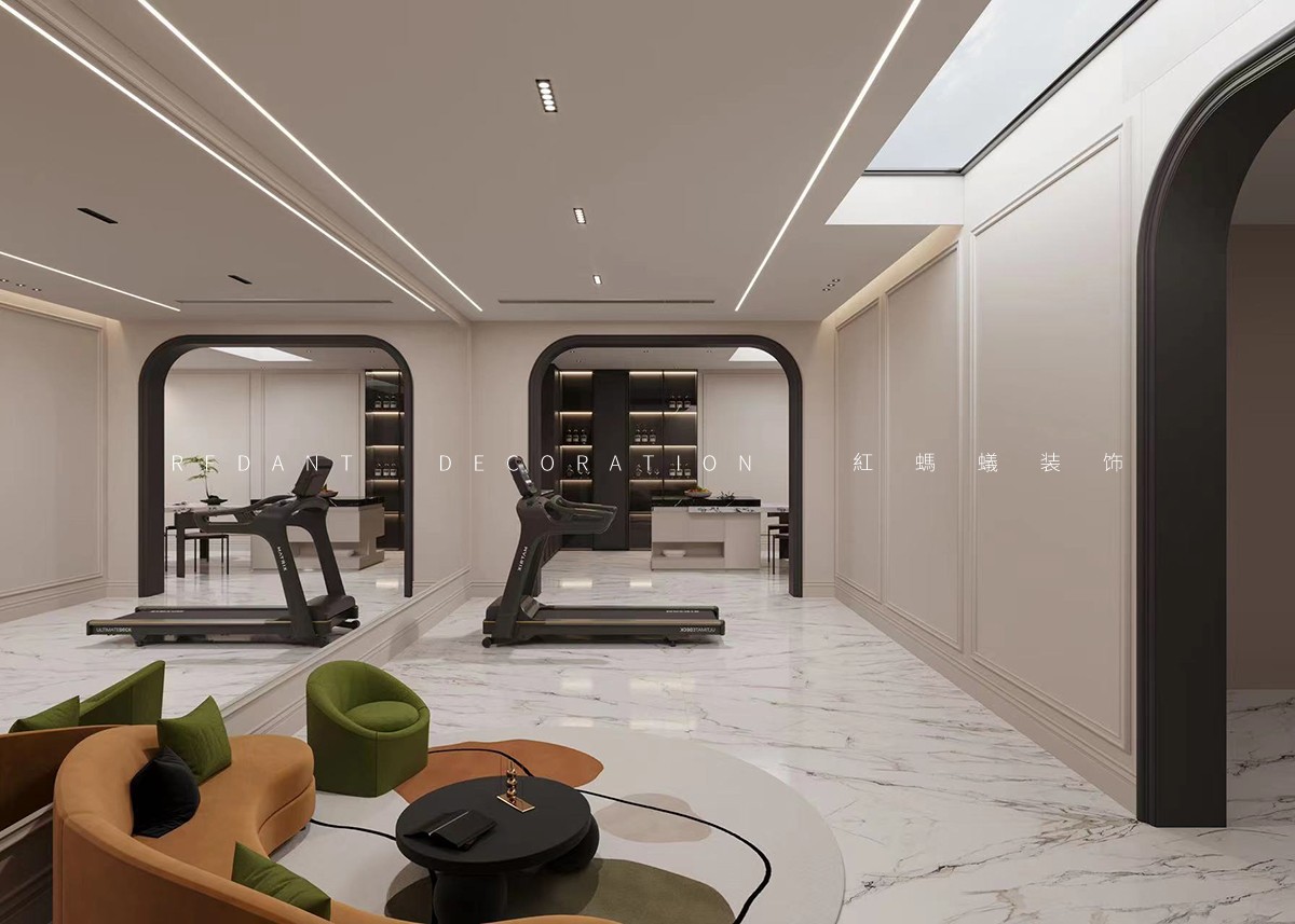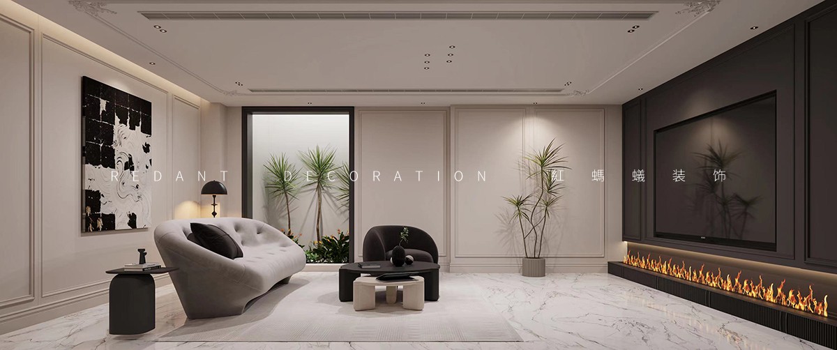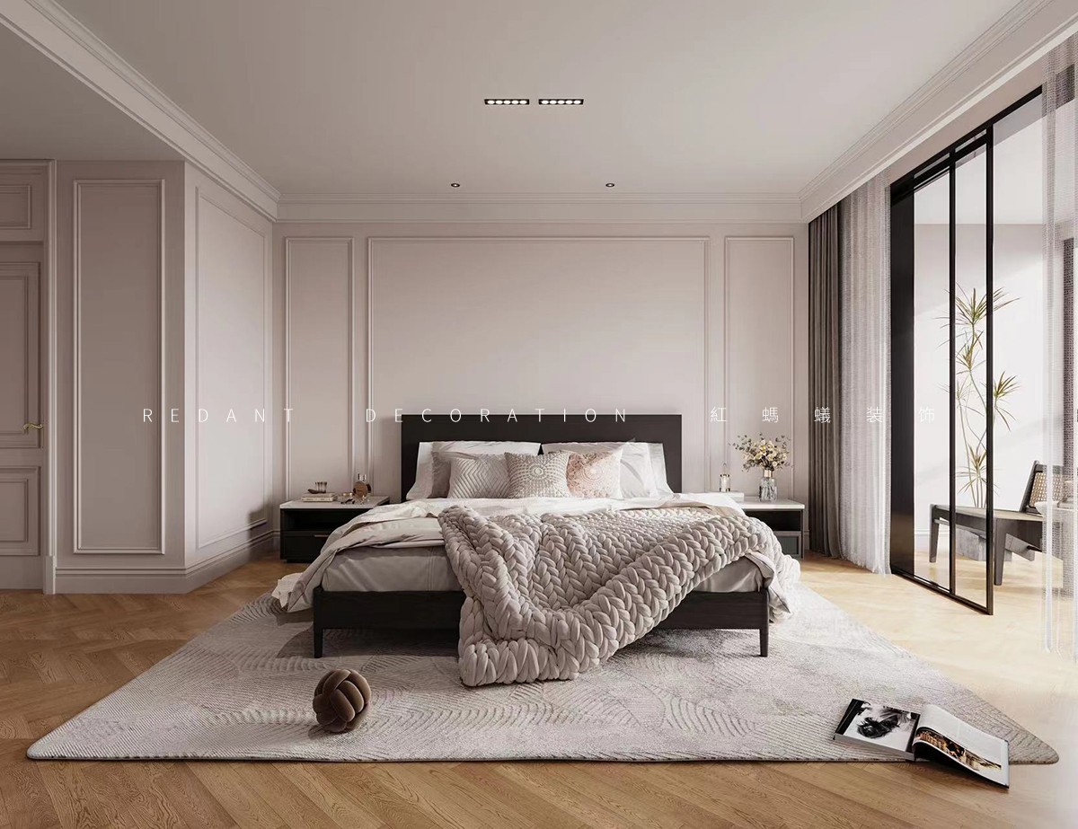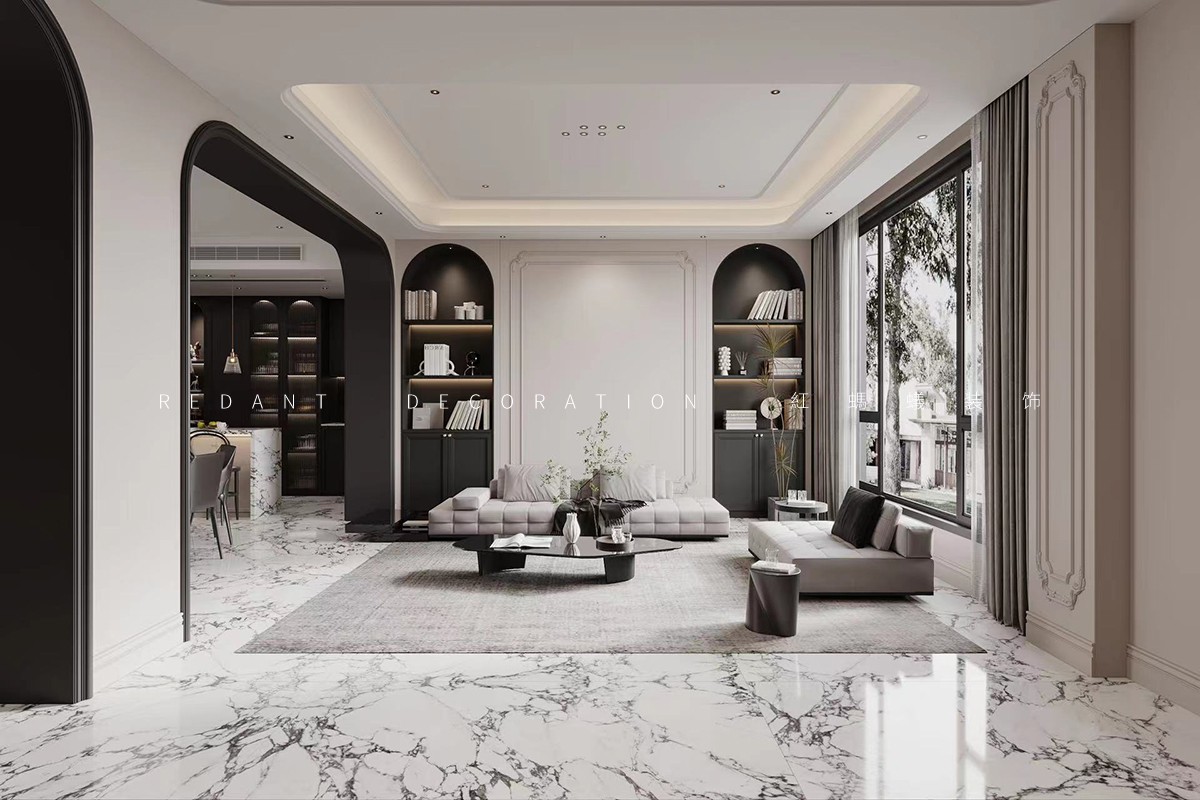 本方案选择了明亮的白色为主色调,并结合了灰色、米色的点缀色,和部分重色增加高级感。在视觉的平衡上,由大块面的简单硬装和家具逐渐过渡到家具上小面积的繁复造型,再到留白的地毯,使空间呈现一种呼吸感。橙色绿色作为跳色,点亮了空间。多次使用圆弧门洞和圆弧的家具造型,柔和空间,增加法式的优雅感。长虹玻璃产生一种半遮半掩朦胧的美感。
