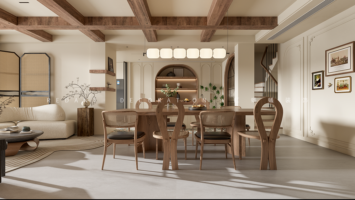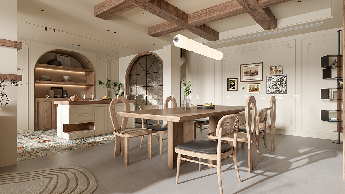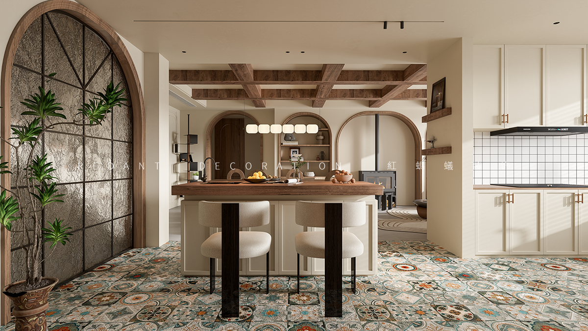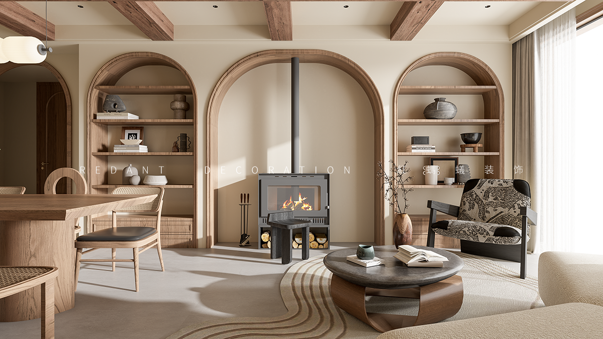 空间布局:开放式客餐厅打破界限,促进互动。弧形元素(拱门、家具 )柔化空间,结合横梁、复古门窗,串联不同功能区,既显开阔又具层次。