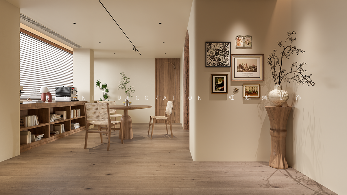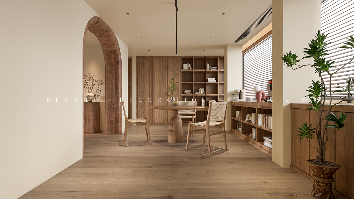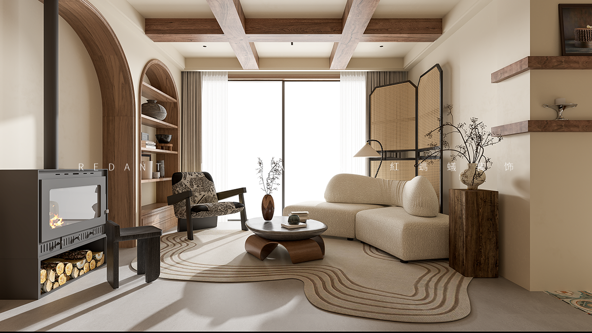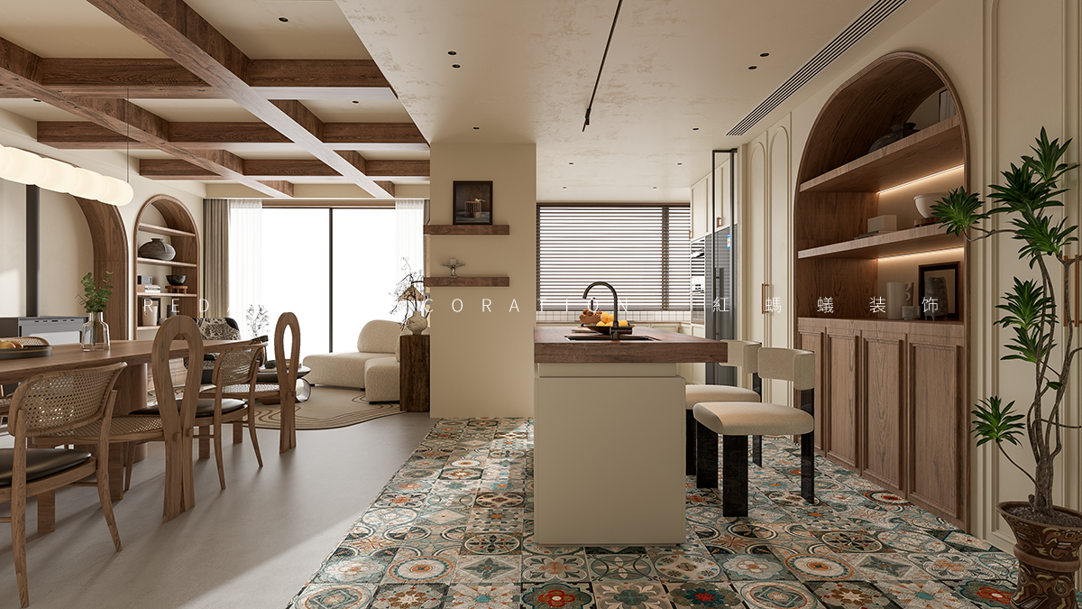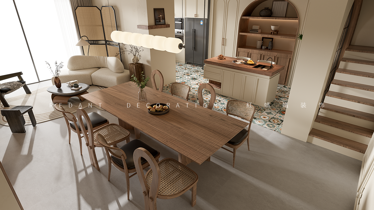 空间布局:开放式客餐厅打破界限,促进互动。弧形元素(拱门、家具 )柔化空间,结合横梁、复古门窗,串联不同功能区,既显开阔又具层次。