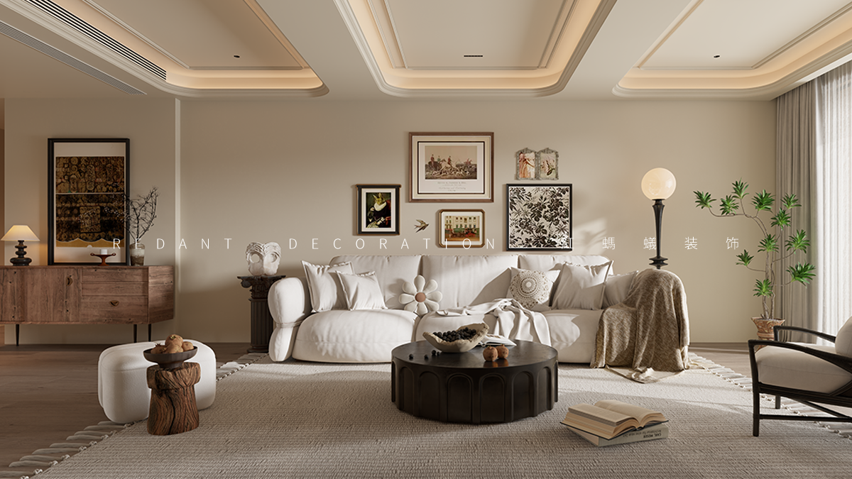 细节与氛围:复古挂画、艺术摆件、绿植点缀,唤醒怀旧情绪。灯光设计注重温馨感,通过主灯、辅灯搭配,营造明暗有致的空间韵律,让居者在自然质朴与复古韵味中,享受松弛惬意的生活 。