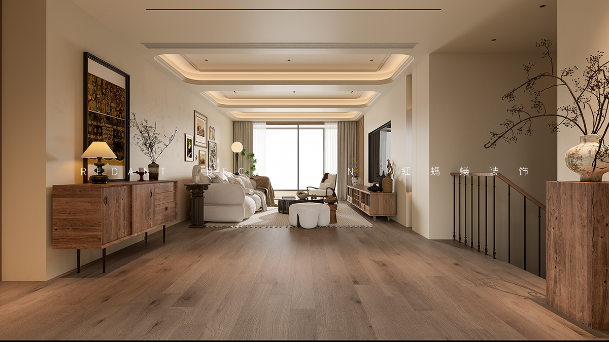 本套空间设计以“自然质朴,复古交融”为理念,营造温暖且富有故事感的居住环境。