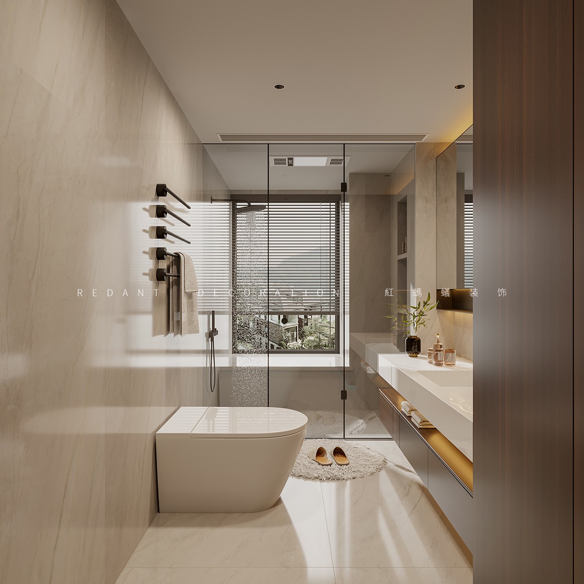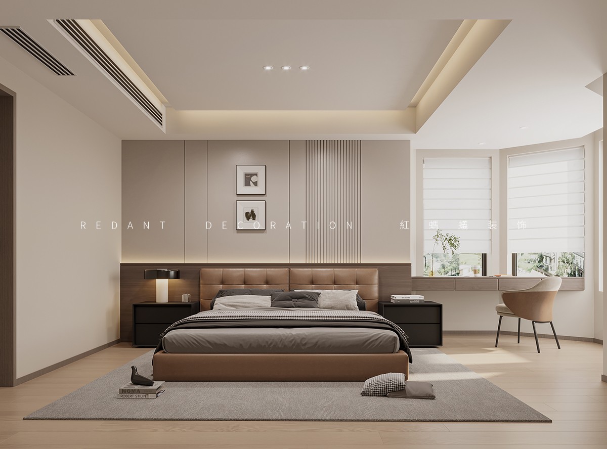 整体色调以高级灰、米白为基底,局部融入香槟金金属线条与墨绿软装,平衡冷调理性与暖调精致。公共区域采用大面落地窗引景入室,地面通铺浅灰哑光大理石,延伸空间纵深感。