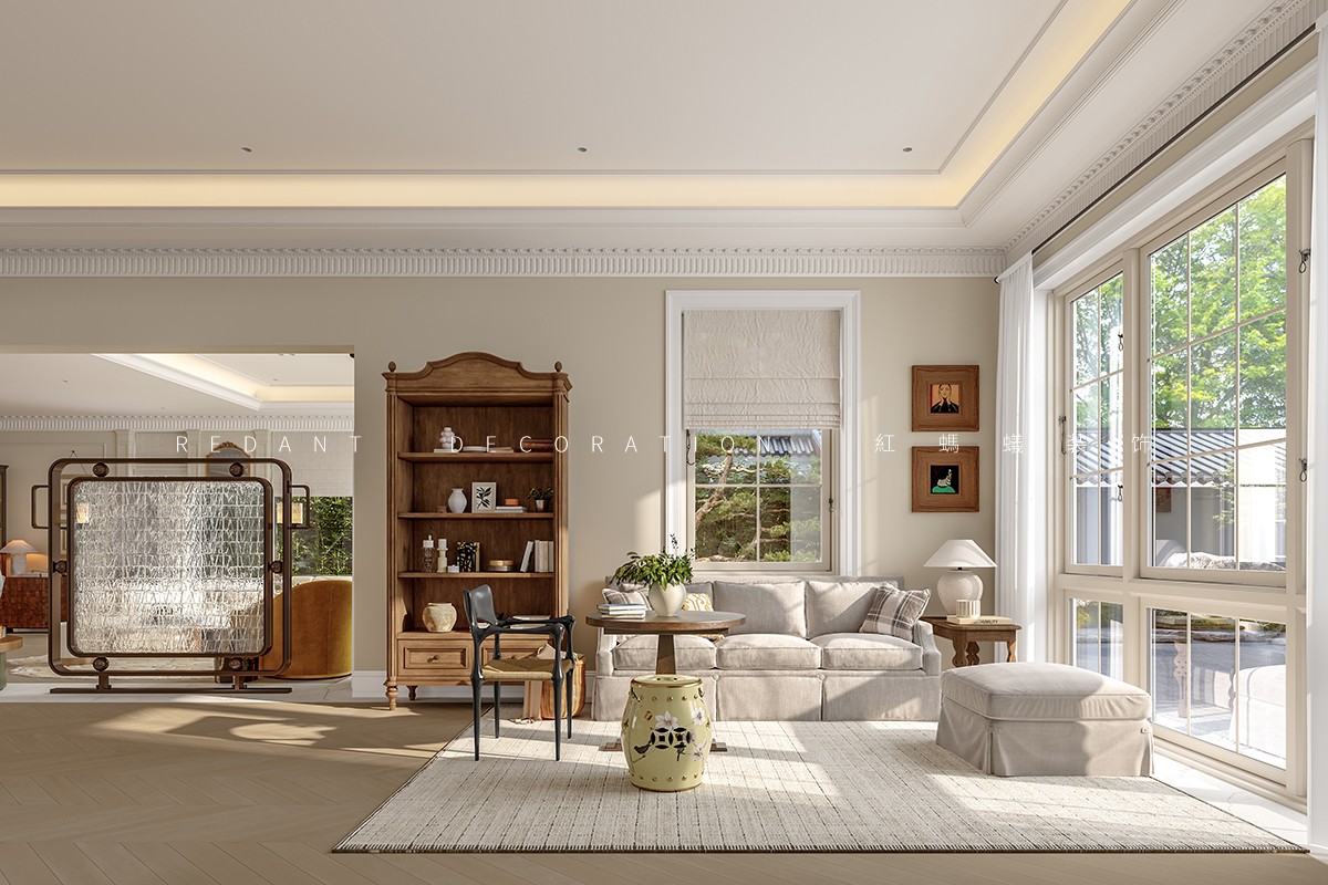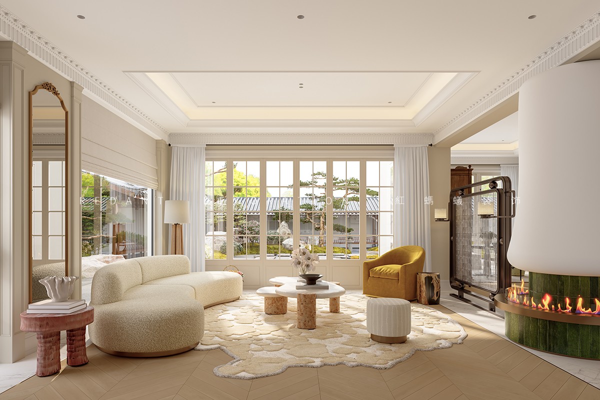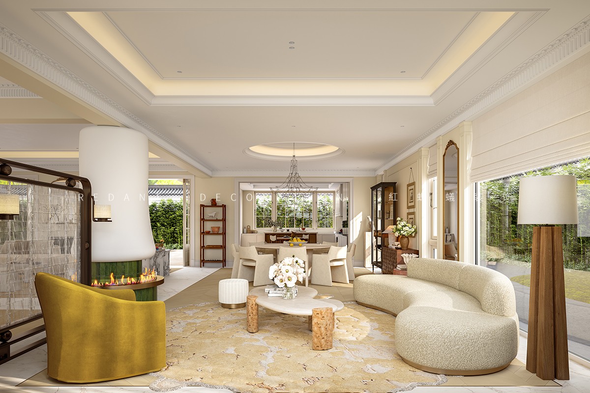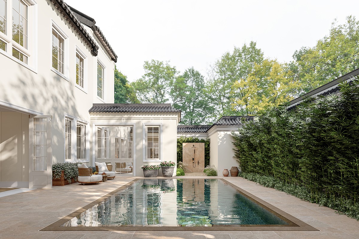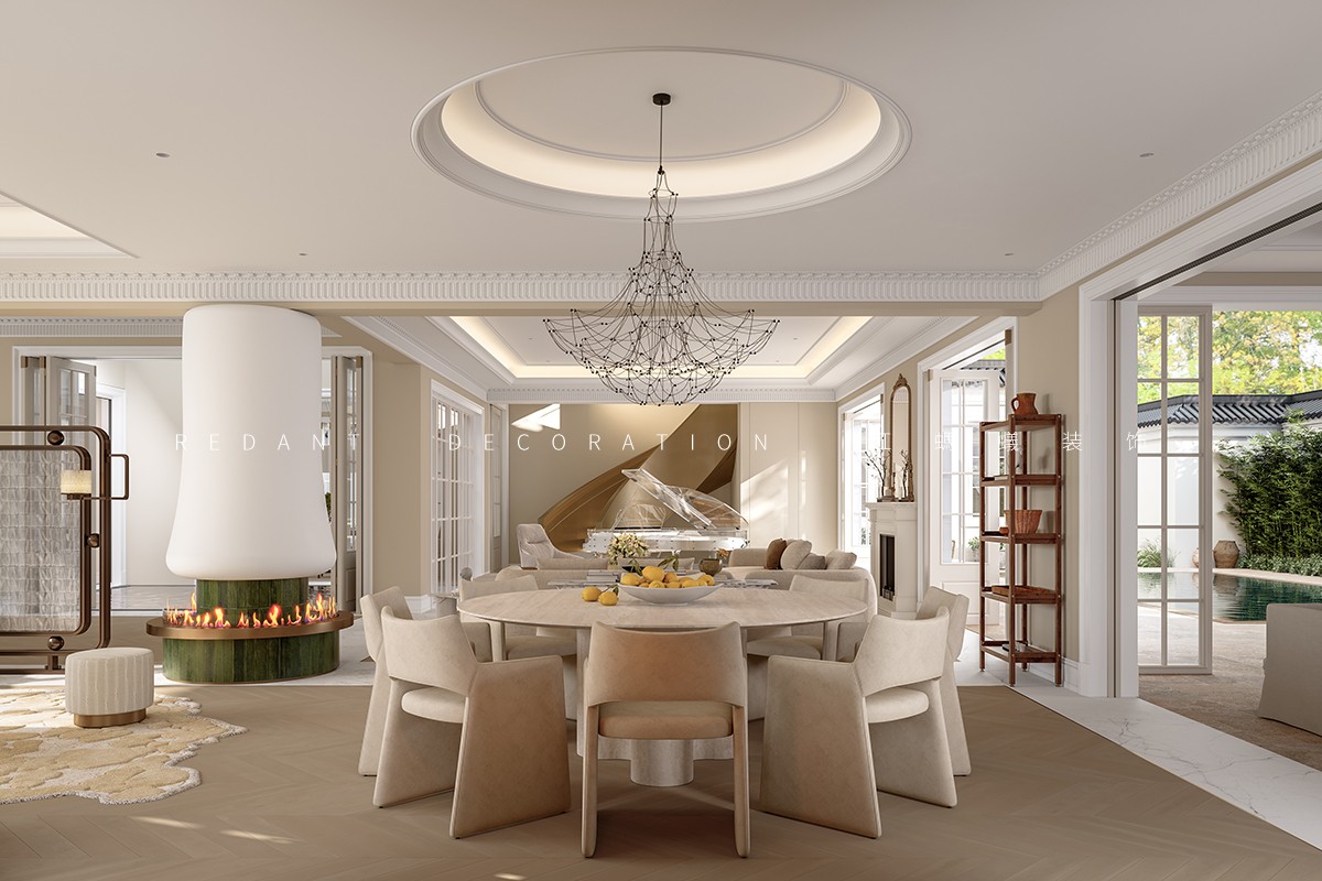 南侧衔接中式院子处,采用落地玻璃门,引庭院竹影、花境入内,实现中式意境与法式浪漫的自然过渡;北侧临近露天泳池区域,搭配白色纱帘与藤编休闲椅,让光影透过纱帘洒入室内,营造出 “推窗见泳池波光,闭户享田园静谧” 的惬意氛围,平衡建筑内外的东方底蕴与法式风情。