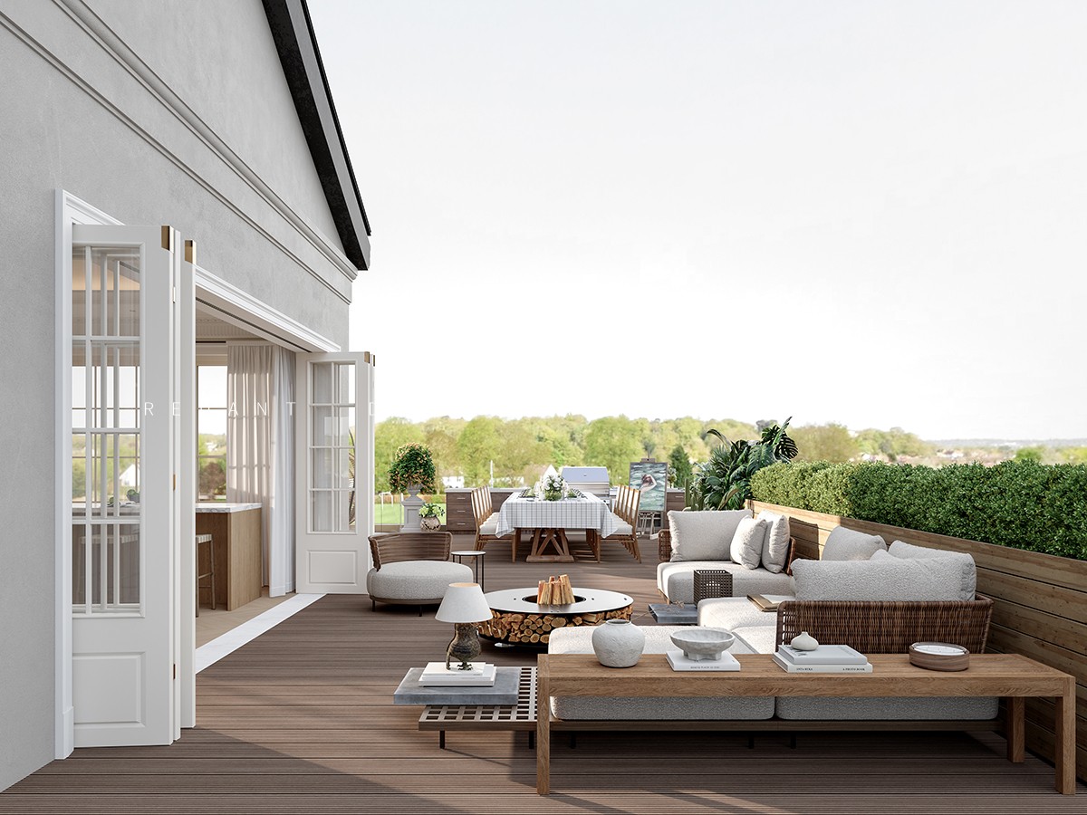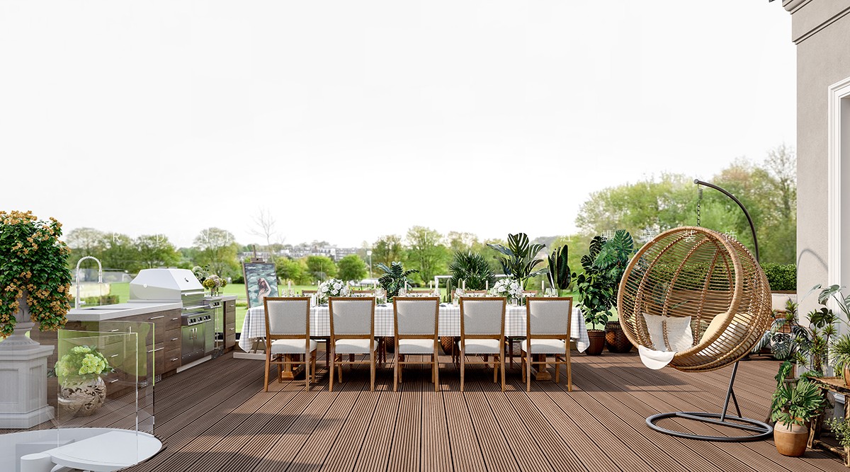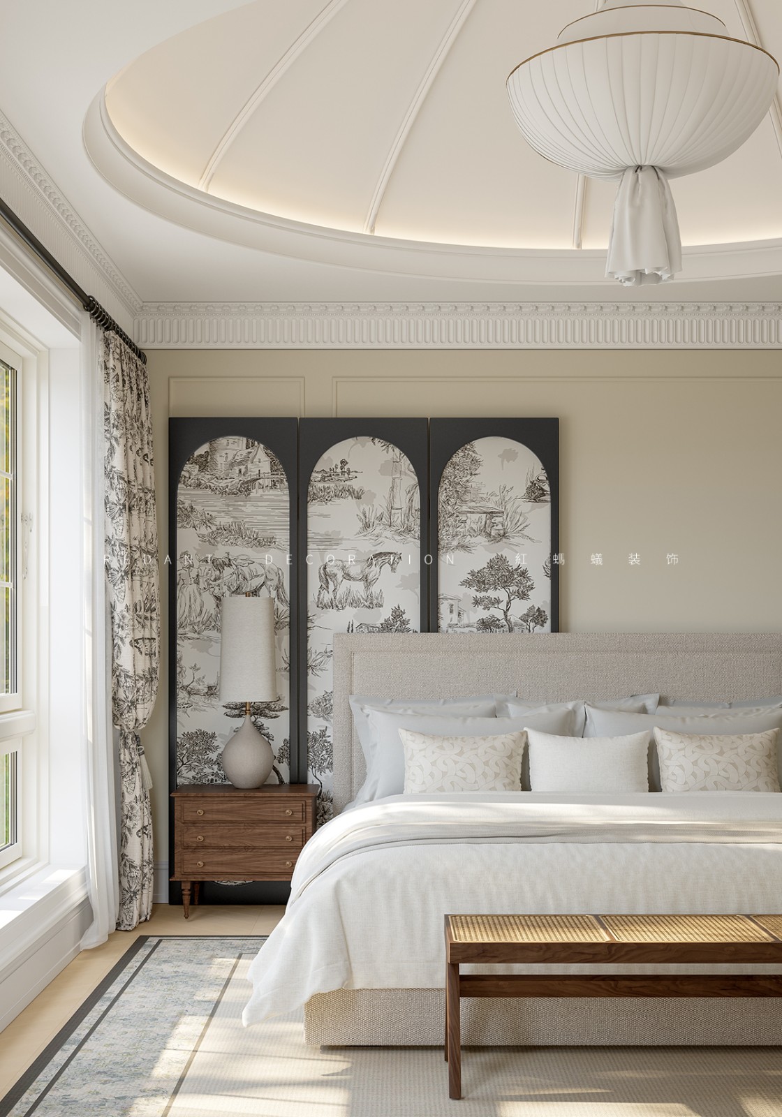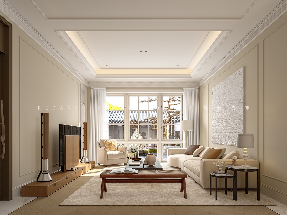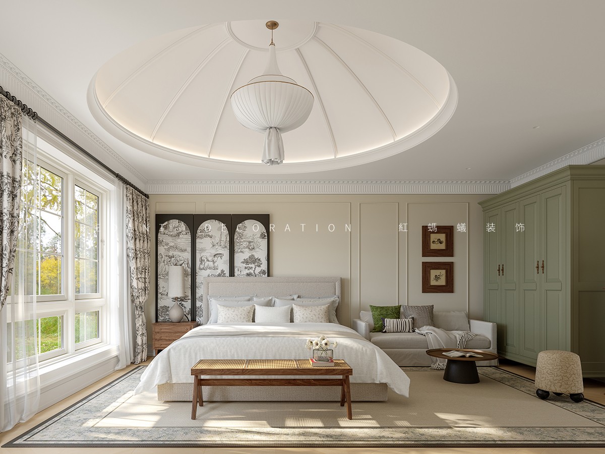 南侧衔接中式院子处,采用落地玻璃门,引庭院竹影、花境入内,实现中式意境与法式浪漫的自然过渡;北侧临近露天泳池区域,搭配白色纱帘与藤编休闲椅,让光影透过纱帘洒入室内,营造出 “推窗见泳池波光,闭户享田园静谧” 的惬意氛围,平衡建筑内外的东方底蕴与法式风情。