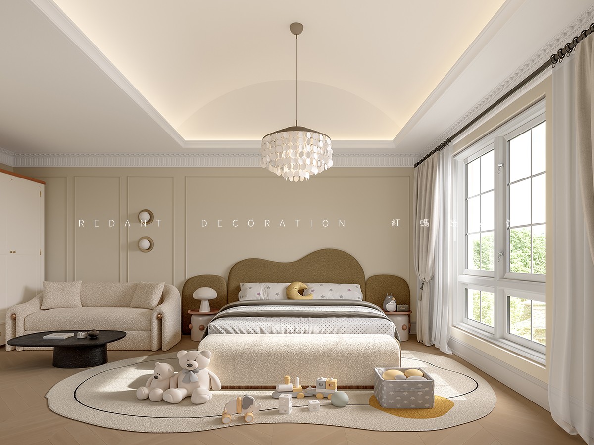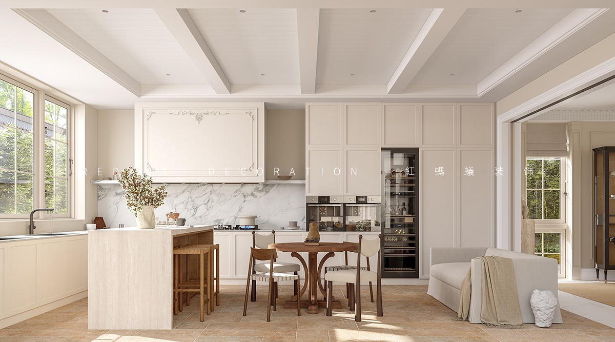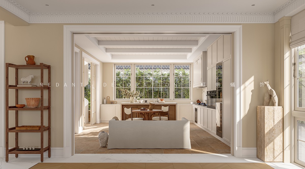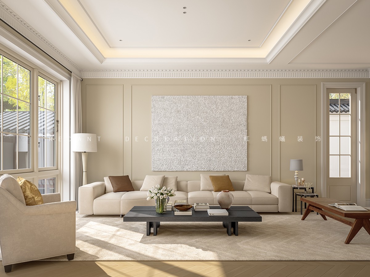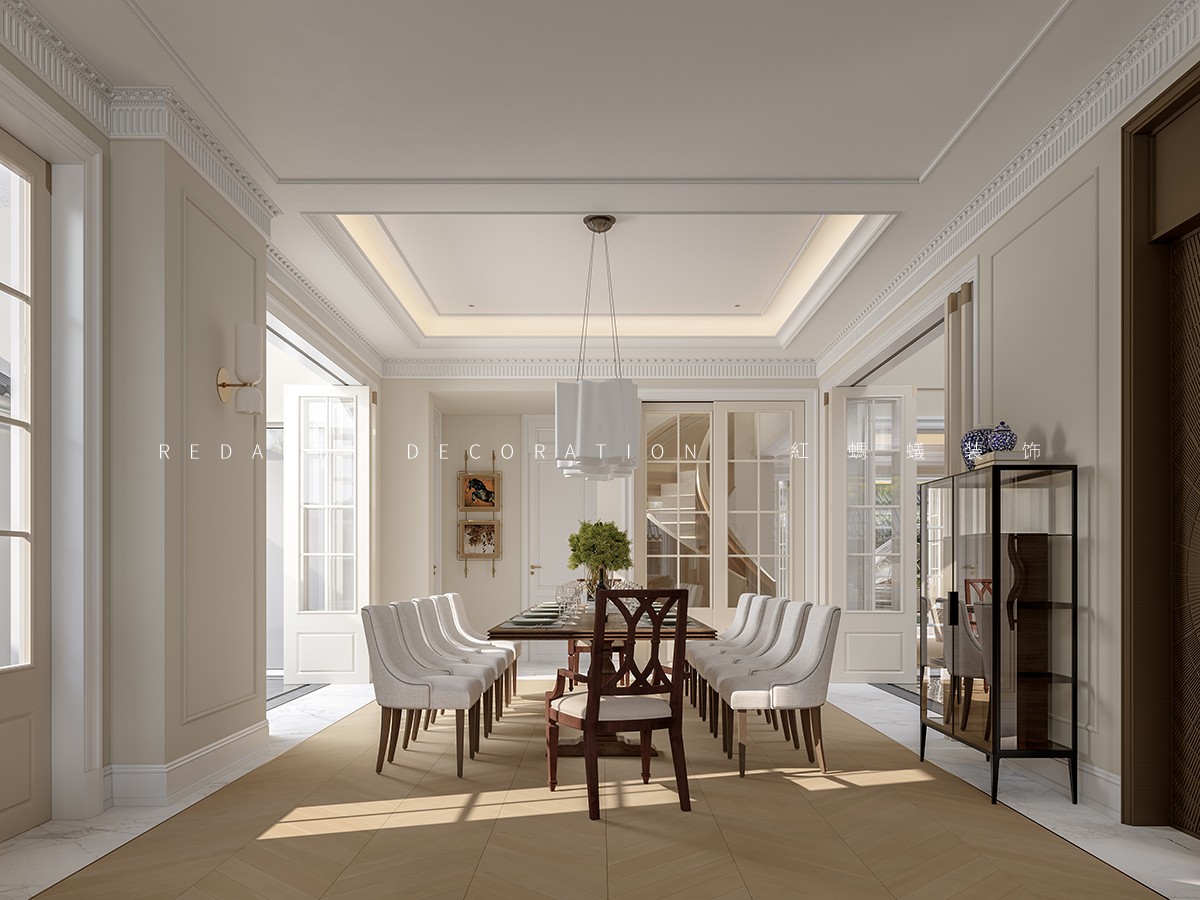 本案以 “东方形制载纳法式浪漫” 为核心,在中式建筑框架内植入法式田园灵魂。室内以奶白、柔粉、浅绿为主色调,墙面局部采用石膏线勾勒精致线条,搭配复古雕花实木家具,营造慵懒温润质感。