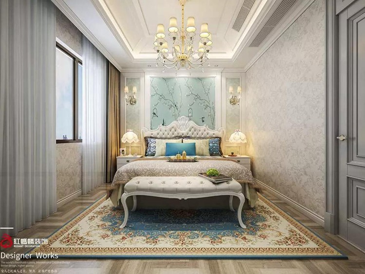 卧室以米白色为主调,给人以舒适、平和之感。美式风格的床头柜和灯具给空间带来精致感,提升了卧室空间的整体格调。