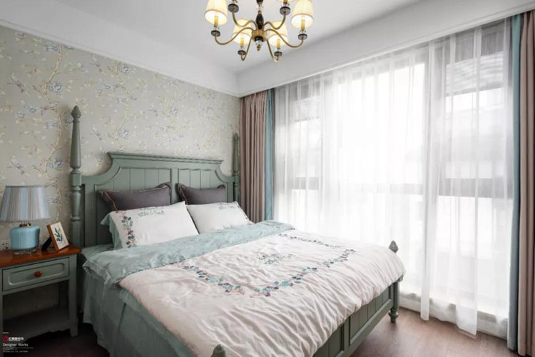 一层的卧室是业主母亲的房间,整个房间用了美式田园风格,果绿色的床,花鸟的壁纸,和布艺的美式吊灯,温馨浪漫这个感觉跟业主母亲温柔又甜美气质非常匹配。