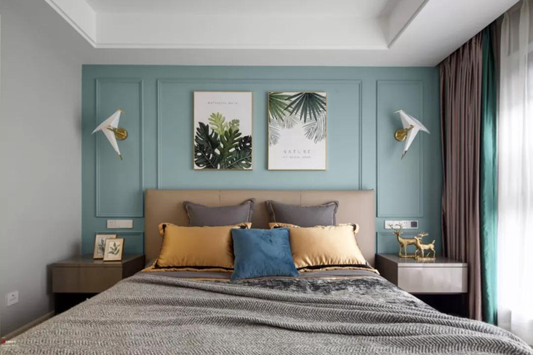 用几根简洁的线条加浅蓝的色彩便勾勒出卧室背景的造型,整个空间温柔又明亮,微风吹来薄纱微微飘起,风轻云淡的幸福生活便由此开始......