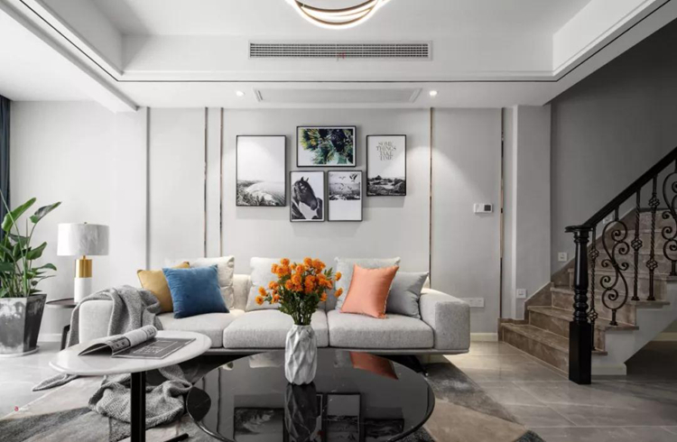 客厅有北欧风的干净素雅,有现代感的大理石电视背景,有沙发背景金属条的点缀,楼梯又有美式的曲线美感,所以整体就是无风格的风格-混搭风。