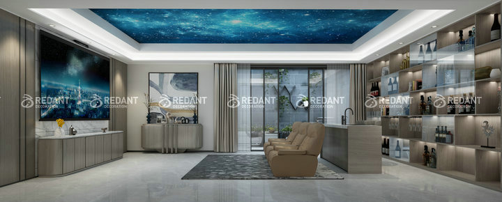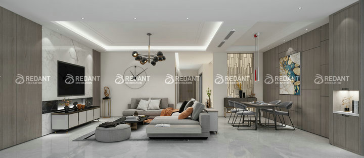 客厅主材明细:道格拉斯瓷砖,BOSS木饰面,菲琳秀墙纸