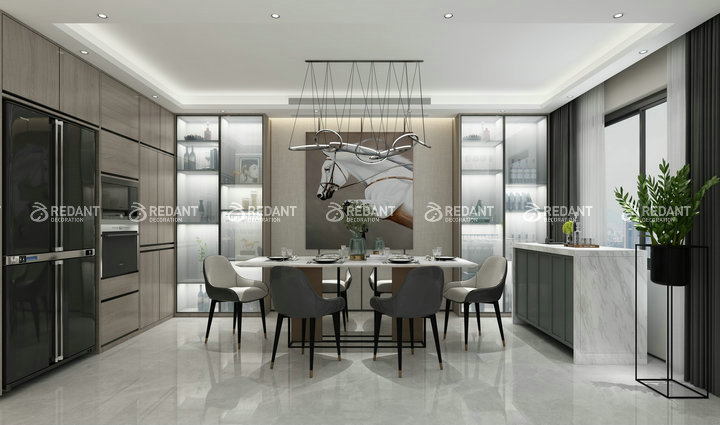 现代简约风格的餐厅灯光既不能太强又不能太弱,最好以温馨和暖的黄色为基调,搭配最简单的吊顶。需要改变原本缺乏系统性的收纳方式,让生活可以更井然有序。而餐桌上的绿色植物,则可以起到画龙点睛的作用,使用餐环境充满生机与活力。