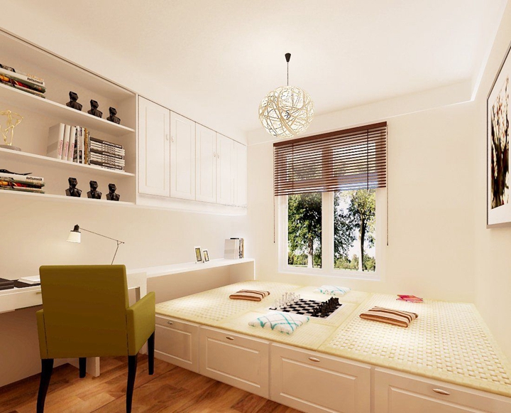 榻榻米不仅有着不俗的外观特色,其内部也就是床下方也是有着强大的储物功能。一般都是设计储物柜,用来收纳一些不常用的东西;当然也可以将其设计成桌子床、椅子、沙发等家具,这样可以避免家具的多余堆放。