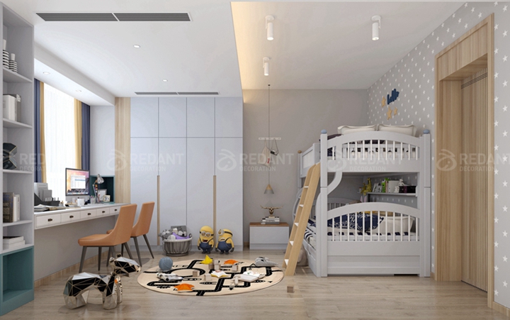 最后要注意儿童房装修的一些事项,儿童房色温千万不要超过4000K。墙面最好不要出现大块的图案和色块,要以柔和的色彩做为过渡。还有小孩子都是有很强的探索欲,随着慢慢长大也会有隐私的需求,所以在儿童房装修中要把生活和娱乐空间需要合理划分。为了防止磕碰到桌角,尽量选择圆角或安装防撞角。
