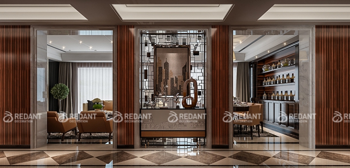 此案设计兼备现代时尚与古典奢华的开放式空间,在宽阔的空间内,营造出舒适且前卫的居家风貌。设计师从玄关处即揭开一场时尚古典飨宴,地坪的深色走遍与地砖的菱形铺贴营造出开阔的迎宾气势。