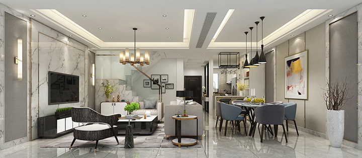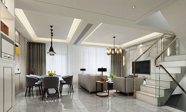 本案在现代设计风格中保留了传统中新中式风格的奢华感觉,而空间布局则符合现代中国家庭的生活模式及喜好,希望通过本案寻找一个更适合现代中国生活文化的空间演绎方式,通过混搭设计手法及形式,打造一个全新风格的效果。空间设计元素变化多味完美的表现对“高品位”、“现代”、“奢华”等全新视觉。空间的通透感与功能区的互动为本案空间布局的一大特点,配以石材、玻璃、皮质的软硬、虚实形成各种对比,有着强而有力的视觉冲击力。