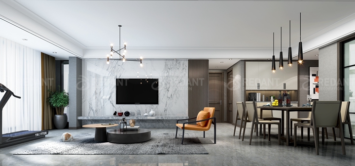 现代风格以其简约的线条及块面感营造出简约而不失时尚的空间。主要材料:大理石、成品护墙、硬包、黑色不锈钢条等。