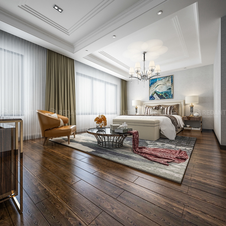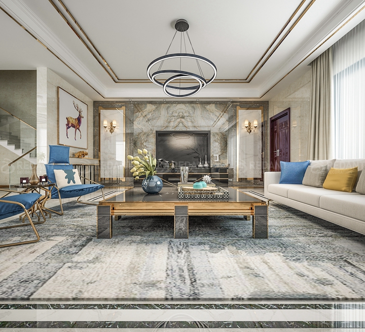 本案现代港式风格,其客厅使用大理石和简洁硬朗的玫瑰金线条。营造金碧辉煌的豪华感,简洁而不失时尚。房间顶面运用了大量石膏线条和叠阶,复杂而不失高贵,结合着浅色壁纸简单中流露出奢华和高雅。
