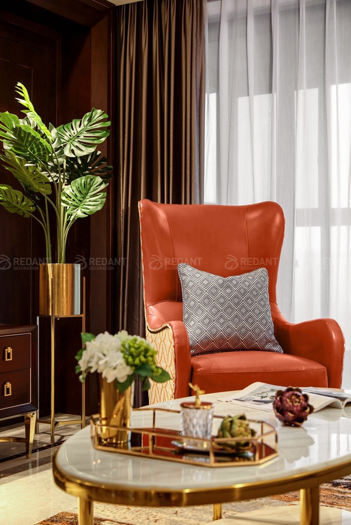 在设计元素上用了比较多的玫瑰金不锈钢线条来勾勒和概括整体空间,加上大理石、软硬包和水晶灯饰的点缀,在整体氛围上营造了一丝轻盈的奢华感。在整体色调上,我们定位的是主题色是爱马仕橙,这与女业主热情洋溢的生活态度不谋而合。