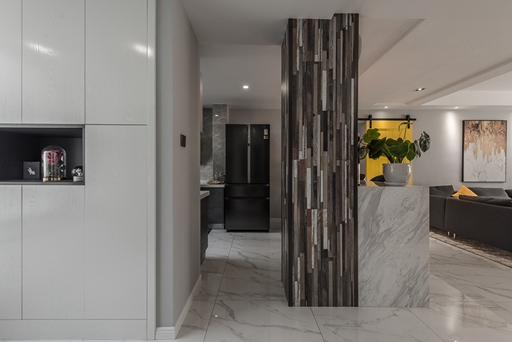 客厅电视背景使用了仿文化石的瓷砖和银柳灰的木饰面相结合,地砖用仿爵士白大理石瓷砖,墙面也是用浅灰色系的有色涂料,整体硬装颜色体现出男主的性格, 沉稳、大方、实用、耐看。