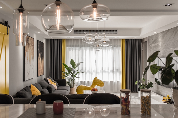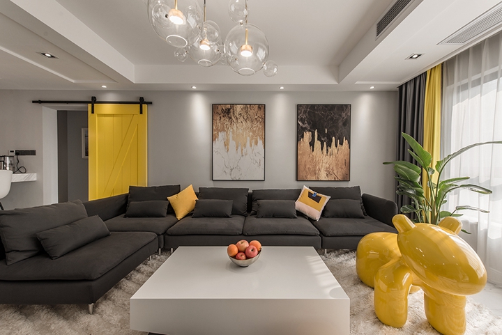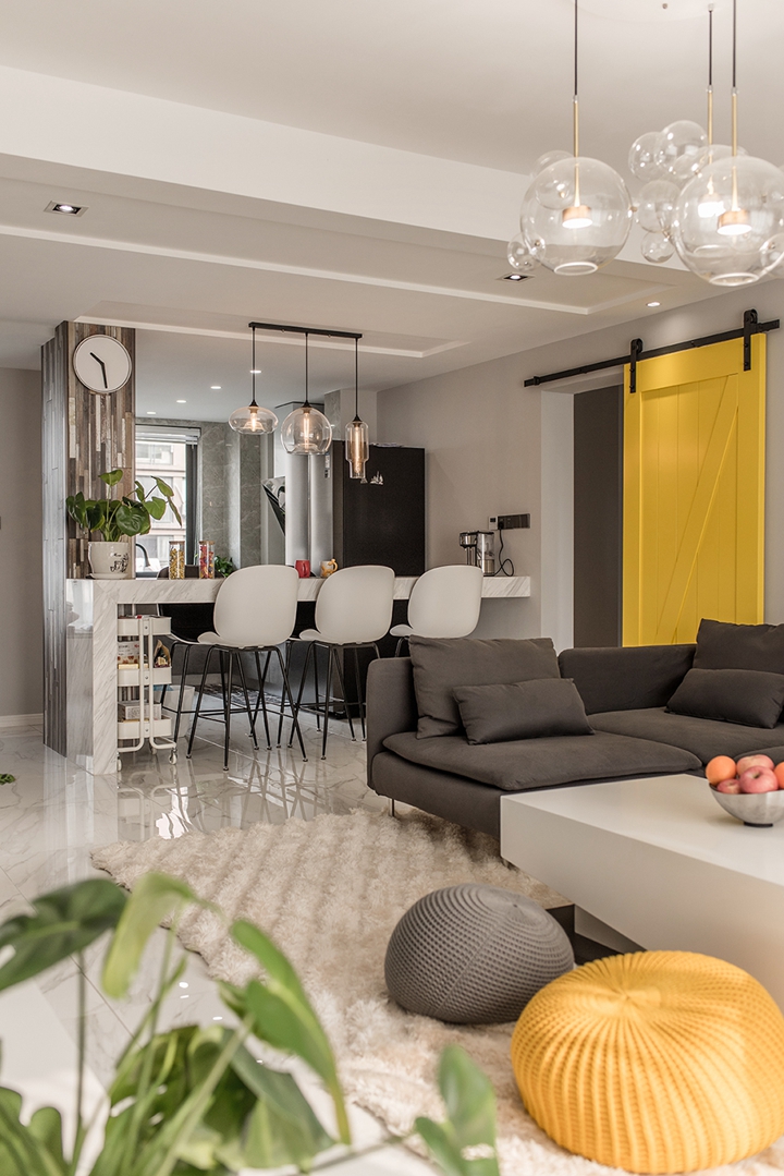 家中的每一处空间,都体现着主人对生活的追求,以及时尚的品味。软装的点睛之笔是使用清新亮眼的柠檬黄色做点缀,比如步入主卧的谷仓门,客厅窗帘的拼色,包括玩偶,挂画,像活泼的女业主性格,开朗,明亮。