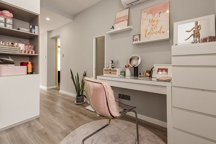 女为悦自者容,所以衣帽间、化妆台必不可少。以白色为主的硬装,并搭配活泼一些的暖色调物品加以装饰,给人一种暖暖的人情味。