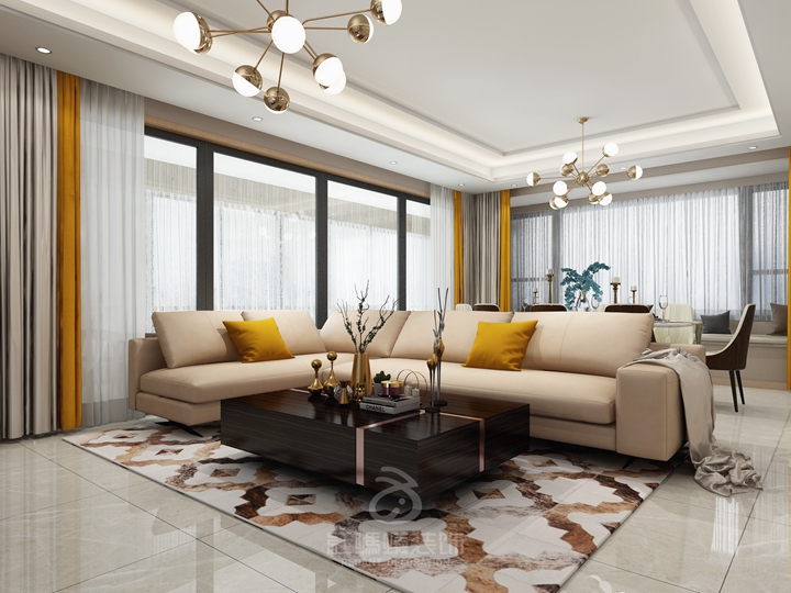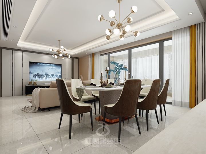 客餐厅融合在一起,将公共区域打通,实现动静分离,这样规划更适合家人的日常沟通,情感交流,想象一下,大家围着餐桌,吃着晚餐,不爱吃饭的小朋友聚集在沙发上看着动画片,大人们讨论着一天中的所见所谓,其乐融融。