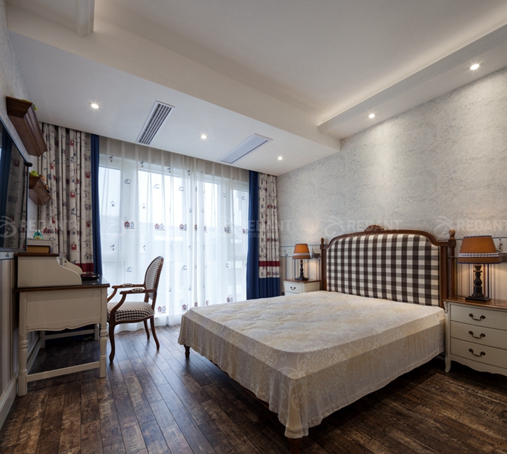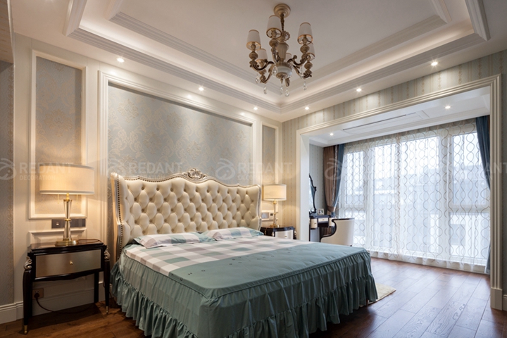 主卧室的优雅格调以温润米白为主色,淡蓝色复古壁布点缀,营造休息空间的舒适氛围,提供了一个新颖的审美视野。