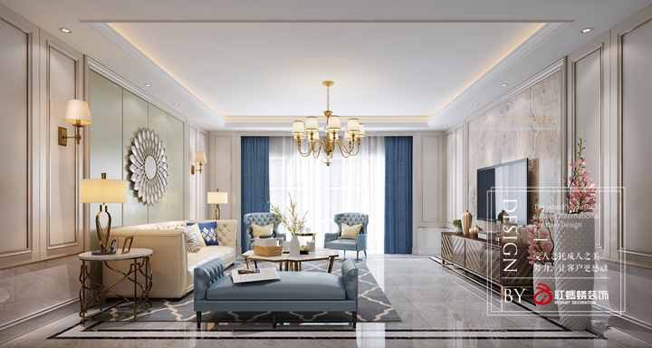 本案设计以米色为主搭配宝石蓝色、金色、金属色,从整体到局部,将古典的浪漫情怀与现代人对生活的需求相结合,兼具华贵典雅与时尚现代。在地面使用石材瓷砖拼花,用石材天然的纹理和自然地色彩来体现整个空间的品质感,是客厅和卧室的奢华气质毫无保留地流淌。在家具配置上浅色皮艺沙发,在软装配饰上则使用蓝色、浅黄色、深咖色等为基调,糅合少量金色使色彩看起来明亮、稳重大方。