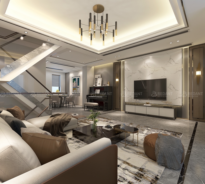 本案出自红蚂蚁装饰,设计师在于客户多方位沟通后,将本案定位为现代简约风格,以简洁明快的设计风格为主调,简洁和实用是现代简约风格的基本特点。在功能方面,客厅是主任品味的象征,体现了主人品格,地位,也是交友娱乐的场合,电视背景墙采用仿爵士白大理石的大砖做背景,既简单又大方,再加上色彩为灰色的壁纸,配上顶部照下来的灯光,整个电视背景墙把客厅提升起来。沙发背景墙只做了简单的处理,精致的硬包配上秀气的不锈钢线条简洁而具有延伸感。