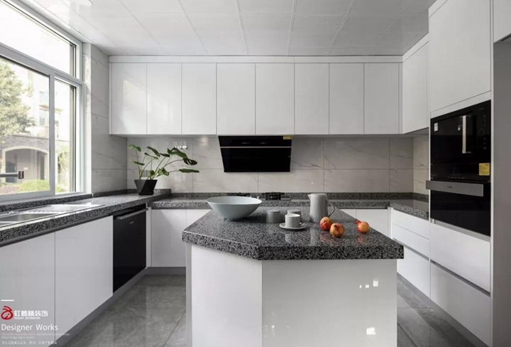 厨房形态简洁,没有不必要的装饰线条,用直线强调空间感。 厨房里保留了基本的橱柜、洗涤、烹饪之外就很难找到其他不必要的东西了。刀叉等工具是用来满足主妇的烹饪基本需要,却不能多得让人分不清如何使用的各种工具。